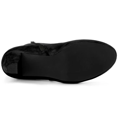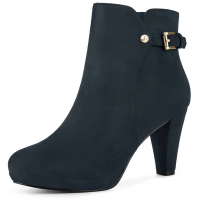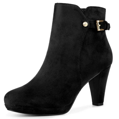 A platform and buckle decor block heel update a faux suede boot that dresses up your favorite dress, suited for casual walking, lounging around dating, and cocktail party in winter.Platform Ankle Boots; Buckle Decor; Chunky Heels; Side Zip Closure; Round Toe. Faux suede vamp, makes your boots look more textured. Rubber Outsole and ABS heel, anti-slip effectively. Moderate heel height, make you feel more comfortable. Heel Height: 3 inches; Shaft Height: 4 1/3 inches; Platform Height: 3/5 inches. Cute round-toe boots, you can pair them with coats and dress for a sweet look.