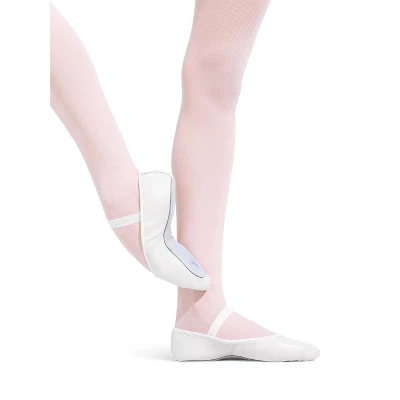 Begin 1/2 – 1 size up from street shoe size. Step up to the barre in the Leather Daisy Ballet Shoe. Features a full sole and pre-attached elastics for a snug fit. Choose between playful daisy patterned lining on the ballet pink slipper or non-print lining on the black or white slipper. This full sole ballet shoe is highly recommended for beginner dancers with a wider foot.