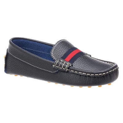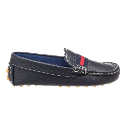 Riviera ready! Made from supple leather in rich, natural tones, our club loafer is prime for strolling by the club—or the playground. Hand-stitching all around, breathable leather lining and insole, and a pattern of rubber pebbles on the shoe’s outer sole and ankle support your little sailor’s steps. Navy and red stripes across the upper bring an irresistible nautical charm, fit for any look. Classic and versatile, pair with dressy and play outfits alike.