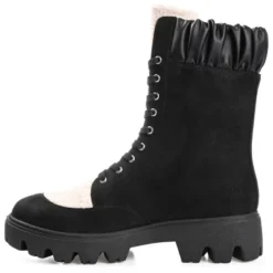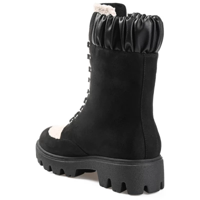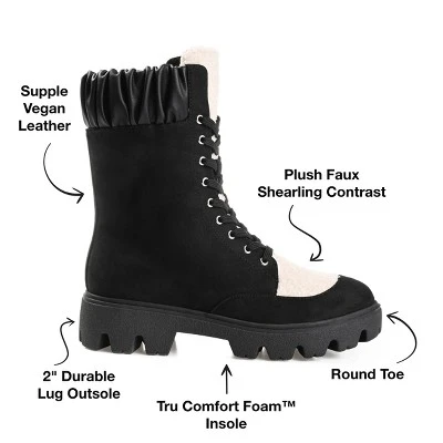 Boldly take on the season in the Elinor hiker bootie by Journee Collection. This vegan leather lace-up style is functional as it is fashionable with a grippy lug sole and a 6 mm Tru Comfort Foam™ footbed. Ruched details cuff the ankle, and a faux shearling detail adds texture to the design. At Journee Collection, our booties will give you that comfortable yet stylish look, perfect for when you’re in the office all the way to a fun night out with the girls.