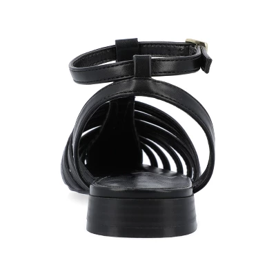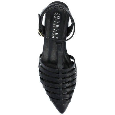 Our Alivia flats from Journee Collection will have you going out in all the style you could ever dream of, from a pair of flats. With its luxe vegan leather, pointed toe, T-strap design, and buckled ankle strap, this design offers style with comfort. A low-block heel and caged details elevate the look.