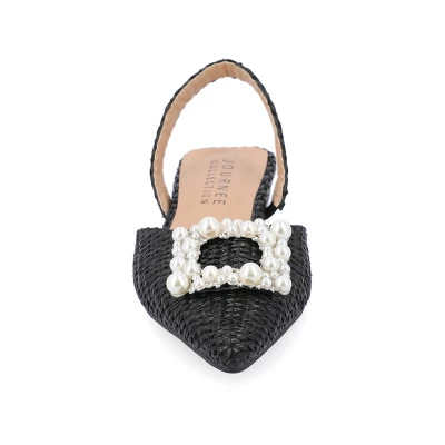 The Hannae flat from Journee Collection will take you from work to a nice dinner outing with ease. This glam flat can match just about everything thanks to the raffia-inspired material, sling-back strap, gem detail and pointed-toe. To add a little something extra, their padded footbed and pull-on closure will keep your feet comfortable with every step.