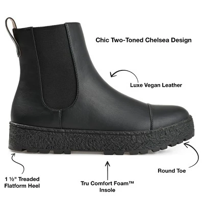 Boldy finish any look with the Jenie by Journee Collection. With a chunky treaded outsole and two-tone details, this high-top Chelsea bootie adds a contemporary finish to any outfit. A super-soft 4 mm Tru Comfort Foam™ footbed and stretch gore panels make them comfy and easy to pull on at a moment’s notice. At Journee Collection, our booties will give you that comfortable yet stylish look, perfect for when you’re in the office all the way to a fun night out with the girls.