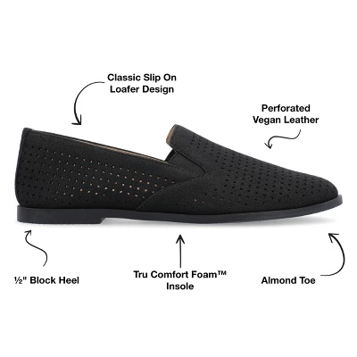 This sophisticated look is detailed with our signature 4mm Tru Comfort Foamďż˝ footbed for all-day support. The Lucie by Journee Collection is a loafer flat elevated by a 1/2 inch block heel. Vegan leather uppers twin notches at the sides and round perforations finish the design. At Journee Collection our flat styles will have you looking just as professional as the boss at work to having the cutest shoes when you go out for the night.