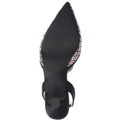 An iconic silhouette topped with vintage details, the Nellia heel by Journee Collection. This darling kitten heel features houndstooth printed fabric contrasted with luxe vegan leather accents for a retro look. A stretchable slingback strap holds you in place, and a padded insole cushions your step. At Journee Collection, our pump styles will let you go from a fun night out with the girls to kicking back and relaxing at the end of the night without any trouble.