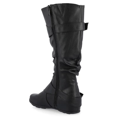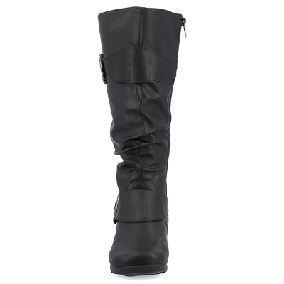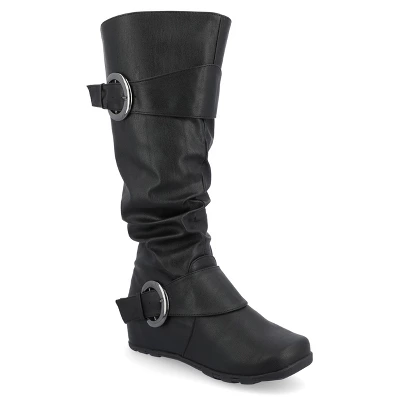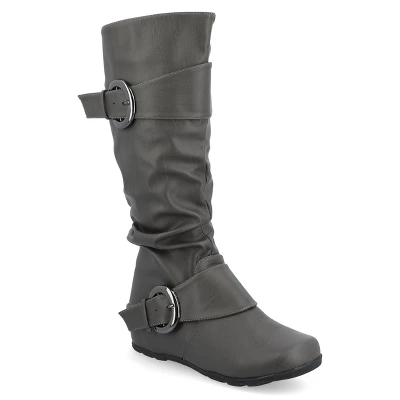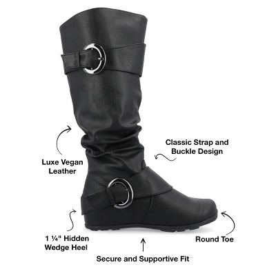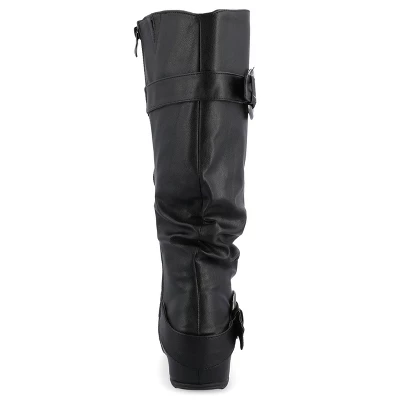 Show off one of the best styles of the season in tall boots by Journee Collection. These fashion boots feature premium faux leather uppers that rise mid-calf and highlight a subtle slouchy design with wide straps and buckle accents. At Journee Collection our boot styles will have your outfit looking even better than before. They will give you that finishing touch that will have your outfit looking straight out of a magazine.