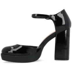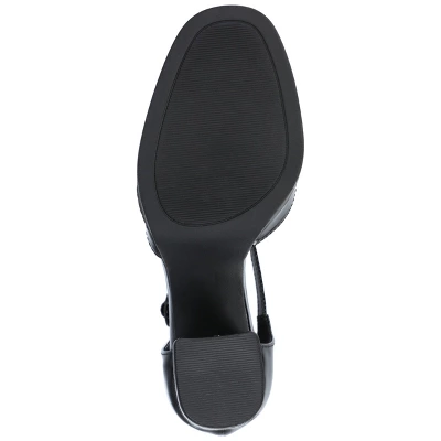 Our Samarr platform heels from Journee Collection are sure to become a favorite thanks to the 4 mm Tru Comfort Foam™ insole. This round-toe style offers a leg-lengthening look with a bold platform heel. Vegan leather and a classic buckle strap finish the design for a classically chic look you can wear on repeat.