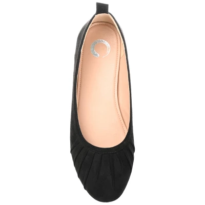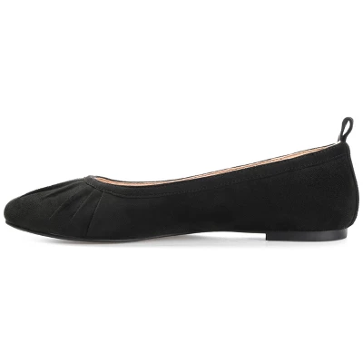 Darling details define the Tannya flat by Journee Collection. These versatile ballet flats feature vegan leather materials sitting on a 4 mm Tru Comfort Foamďż˝ insole for extra comfortable wear. Classic round toes and a contemporary ruched design at the top finish this eye-catching style that looks great dressed up or down. At Journee Collection our flat styles will have you looking just as professional as the boss at work to having the cutest shoes when you go out for the night.