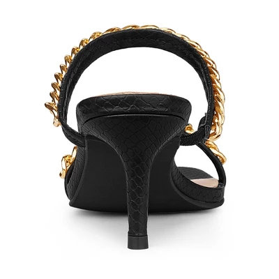 A must-have in every girl’s closet! Thin chain straps bring summer flair to the party, and these leather sandals feature a snakeskin-print silhouette with a mid-stiletto heel. Unique square head design allows you to take off easily. Design Details: Chain Straps Slide Sandals; Snakeskin Printed Design; Square Toe; Stiletto Heels; Slip-on Closure; [ Material ]: 2 colors: Black, Brown Faux Leather(Snakeskin)+Chain Upper; Rubber sole; ABS Heel; Heel Height: 2.8” (approx 7cm).