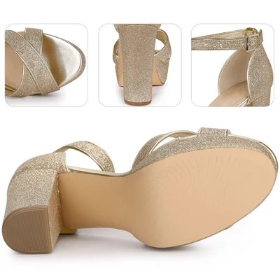 - Open Toe, Crisscross Strap, Block High Heels, Glitter Upper, Buckle Closure, Platform Heels Sandals