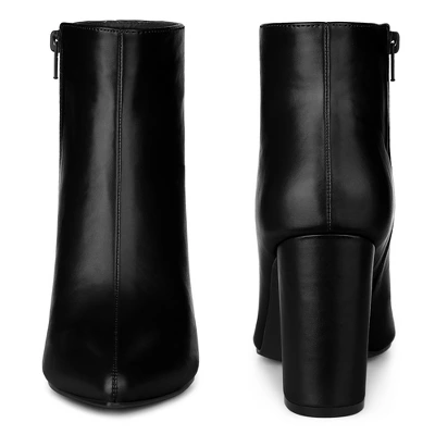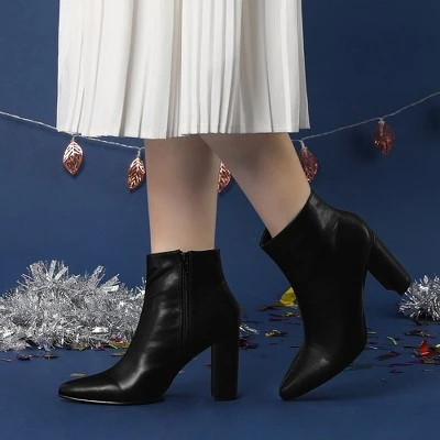 Sculpted into a sleek silhouette yet meant to fit comfortably, this PU leather ankle bootie features A-line to toe to give you graceful with the high heel. These ankle boots have a flattering style that looks great on everyone.Block Heel Ankle Booties;Pointy Toe;Side Zipper;Occasion: Party, Office, Casual, Christmas Days, Dating, Evening;Vamp: PU; Outsole: Rubber; Heel: ABS;Heel Height: 3 5/9 inches; Shaft Height: 4 1/8 inches;
