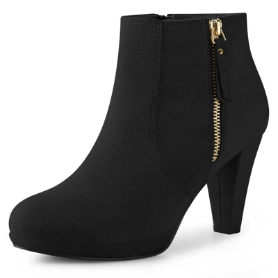 - Platform, Round Toe, Side Zip Closure; Chunky Heels Boots