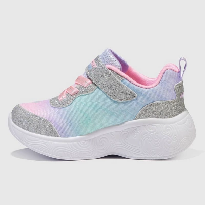 Reach for the skies in magical unicorn style and comfort wearing S Sport by Skechers Lillien. This lightweight slip-on sneaker features a star and heart print mesh fabric upper with synthetic glitter finish overlays in a stretch-laced sporty casual sneaker design, adjustable instep strap and a shock-absorbing light-up unicorn accent midsole.