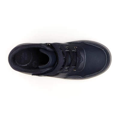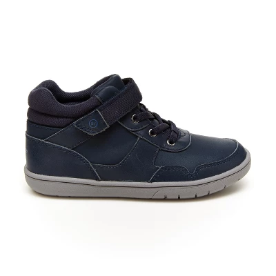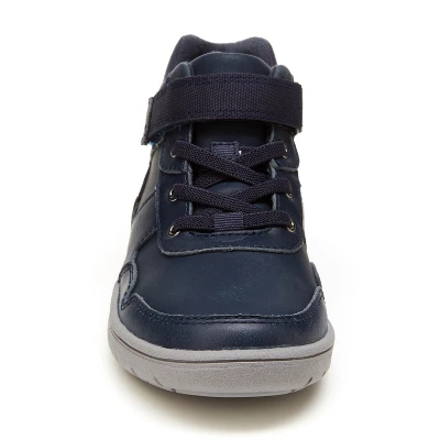 - Toddler boy’s shoe with leather uppers and hook and loop closure for easy on off