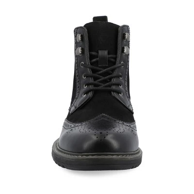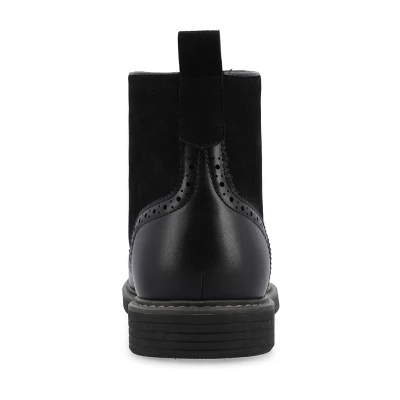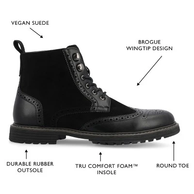 Introducing the Virgil ankle boot by Vance Co. These versatile boots are crafted with vegan leather and feature vegan suede accents, making them a stylish and animal-friendly choice. With a comfortable 6 mm Tru Comfort Foam™ insole and a lace-up chukka design, they provide all-day comfort and a secure fit. The 1-inch block heel, round-toe shape, and wingtip detailing give these classic ankle boots a touch of sophistication, making them perfect for both casual and formal occasions.